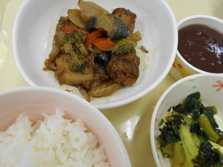 | ナポリタン1(11/11) 洋風のメニュー。 皆さん良く召し上がっていました。 本日のスープはキャロットスープ。 おいしかったよと声をかけていただきました。 | アンコウの和山椒炒め(11/17) アンコウの唐揚げをほかの野菜と共に 和山椒の風味でソテーしました。 初めてアンコウを食べた方も いらっしゃいました。 |