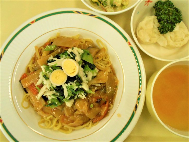 2月4日 昼食 ミートソース 皆さん良く召し上がっていました。 | 2月16日 昼食 チーズヤンニョムチキン 「とてもおいしかった。」との 意見をもらいました。 | 2月18日 昼食 酸辣あんかけ焼きそば 辛くて食べられない方もいました。 すみません。 |